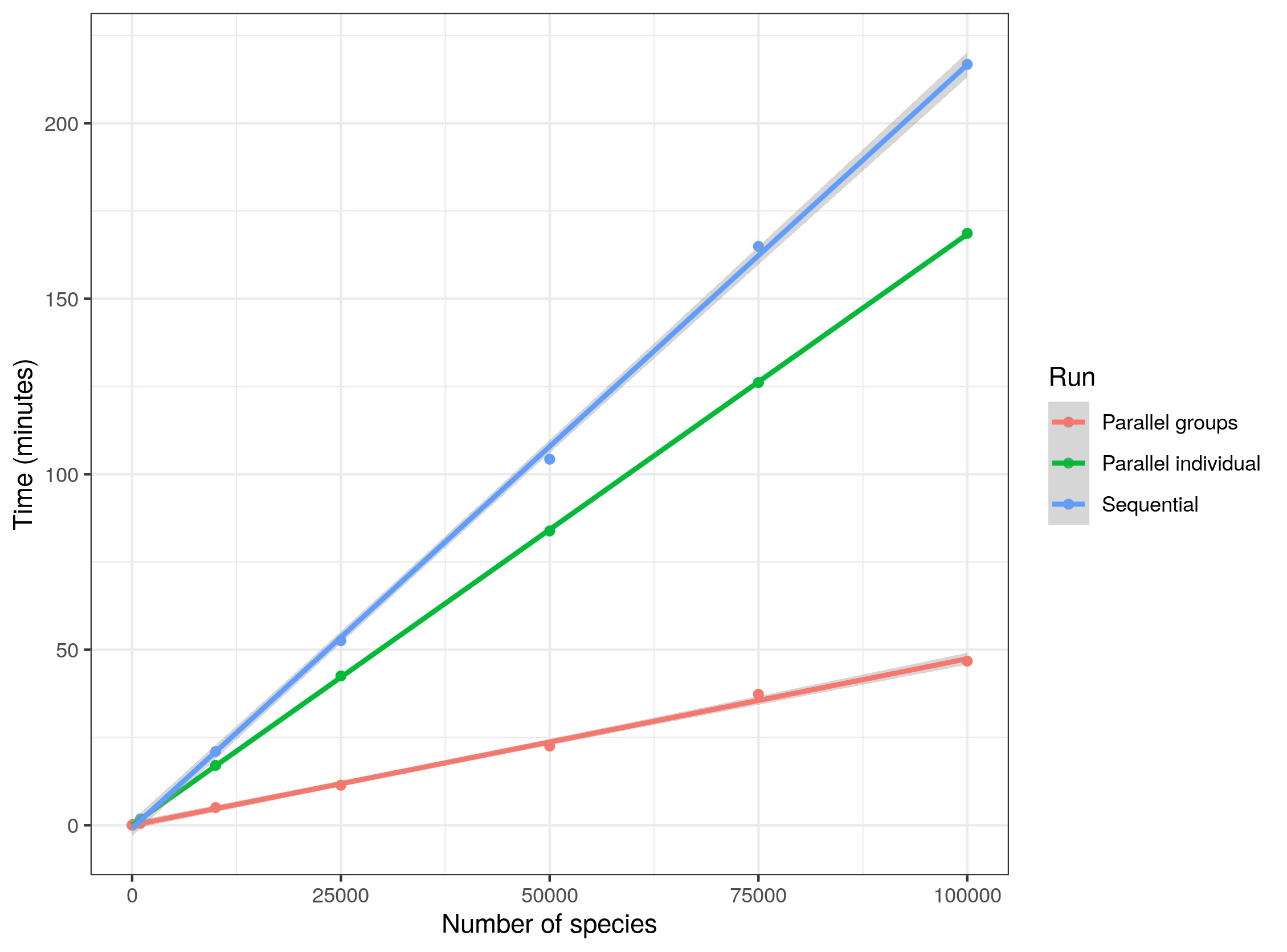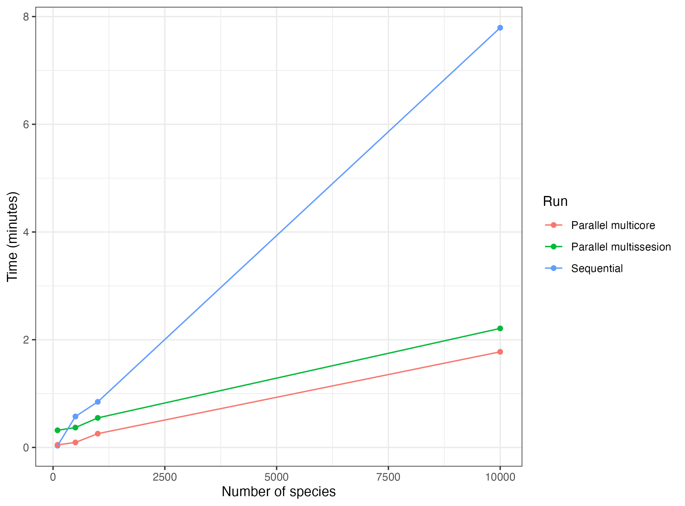Check the following graph to decide whether do you think it is worth running the code in parallel. It shows the results of a test on a notebook using 3 cores and three different strategies (sequential, multicore, and multisession) to harmonize random samples of names in the TRY database of different sizes.